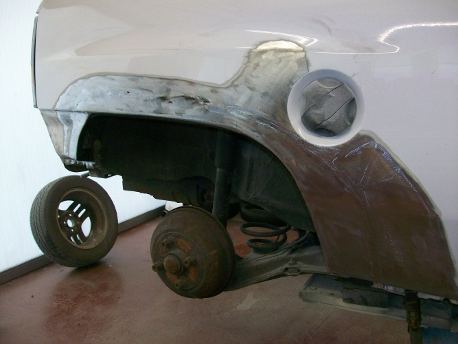 Seitenwände gespachtelt und aussen und innen gefüllert (Füller leicht blau eingefärbt keine Ahnung wofür das gut sein soll aber egal) Geschliffen und mehr oder weniger bereit für die Lackierung... Als ich aber sah das er tatsächlich teilweise wieder Kit reingeschmiert hatte hinten um die Radkästen hat mich fast der Schlag getroffen...