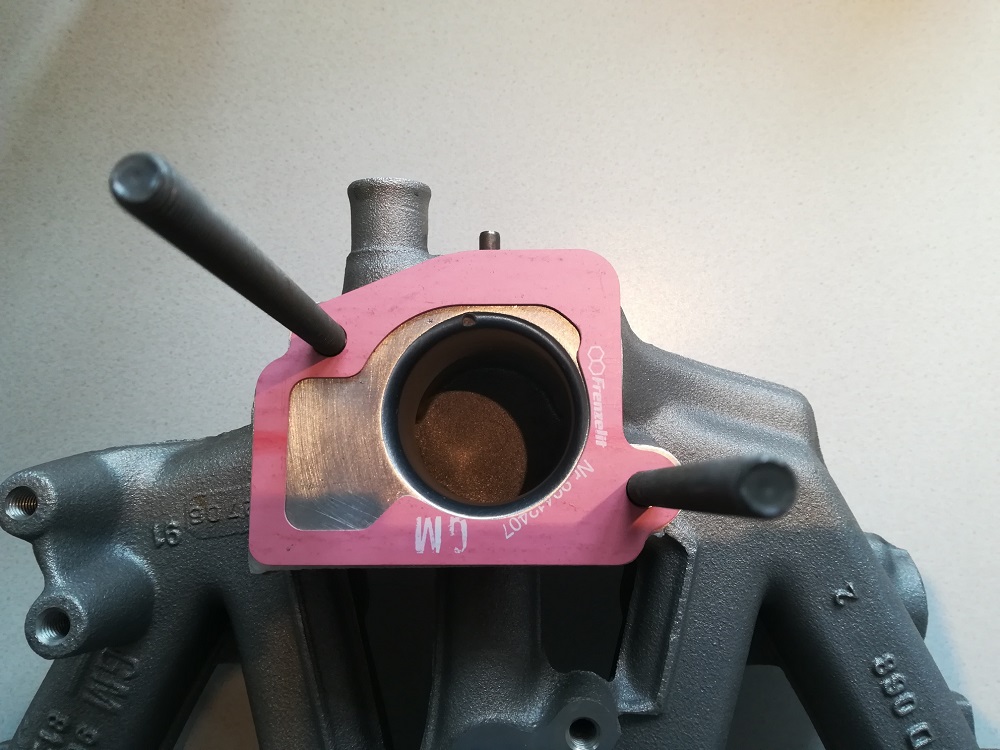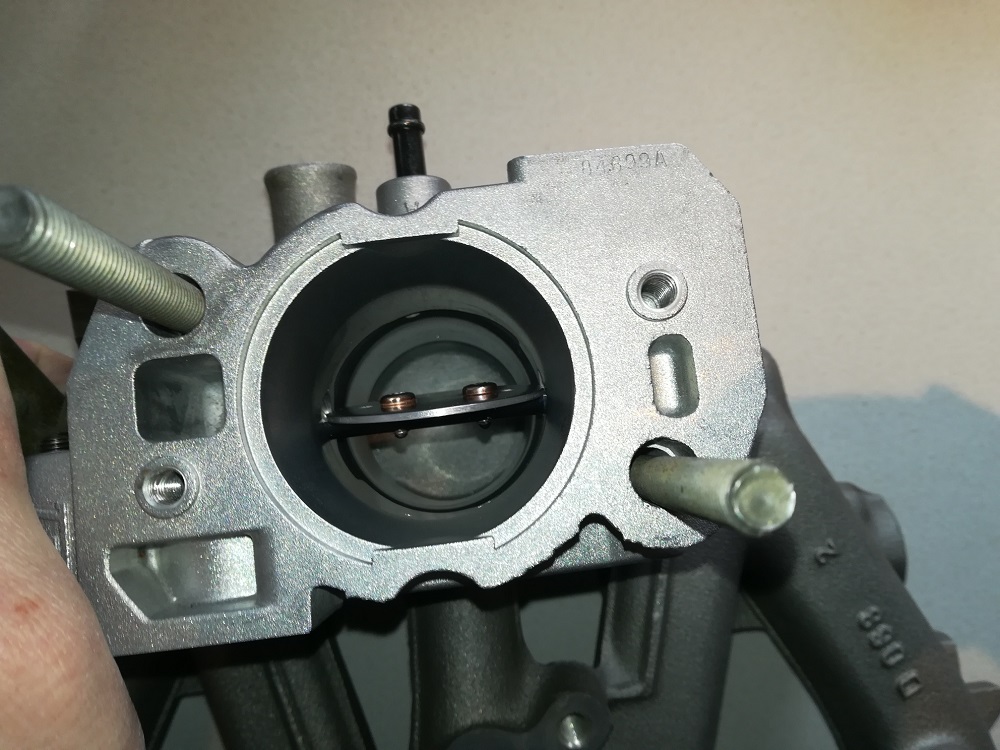So, Drosselklappe wurde leicht bearbeitet, eine gewisse "Grundrauigkeit" bleibt aber erhalten, auch wenn es nach "Poliert" aussieht. Die Kupferschrauben wurden im gleichen Atemzug mit der Feile abgerundet. Die Dichtung zwischen Drosselklappe und Ansaugbrücke habe ich mit einer Nagelschere vergrößert.