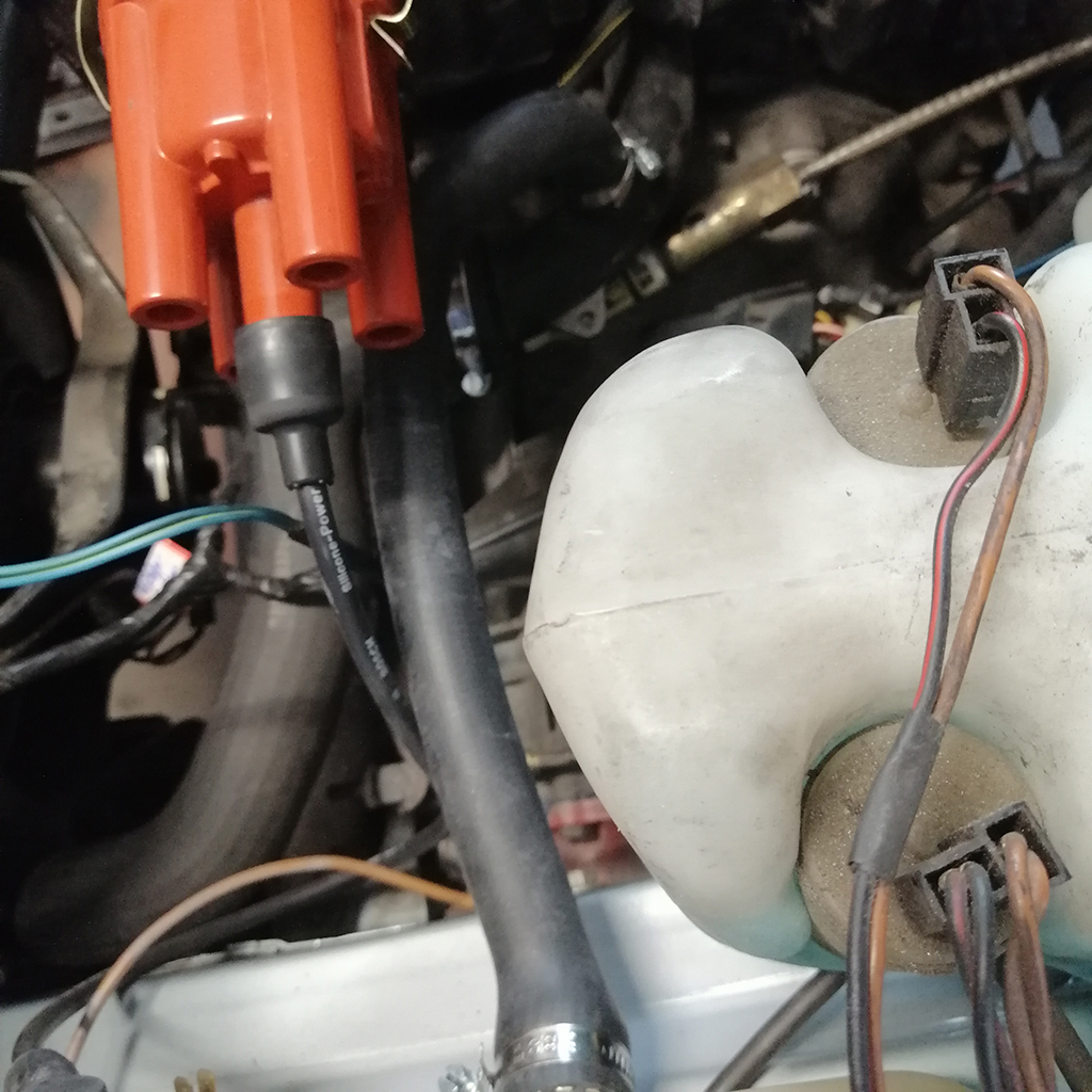 Geht durch ein Loch in der Spitzwand rein und sitzt dann überkopf unterm Batterieblech/Wasserkasten.