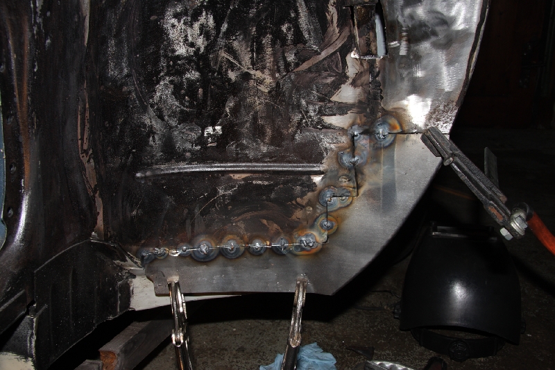 Anschliessend von einem neuen Reparaturblech die Hälfte abgeschnitten, punktverschweisst und die Schnittfläche auf Stoss verschweisst. Ist also nix mit rumgeflicke