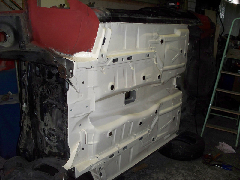 so gestern ging es weiter... haben den unterboden komplett sauber gemacht und ich hab die risse unter den sitzen ausgebohrt und neue bleche eingeschweißt. danach hab ich schonmal eine schicht des ersten wundermittels aufgetragen. ich finde das ergebnis kann sich sehen lassen :)